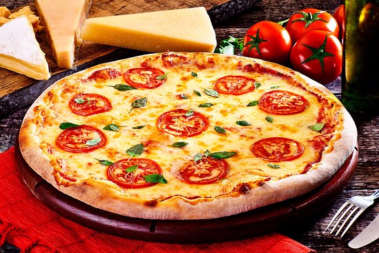Pizza Grande de 35cm 8 pedaços, recheada com mussarela, tomate, manjericao, molho de tomate e orégano