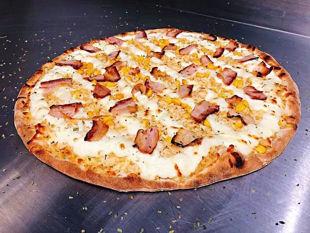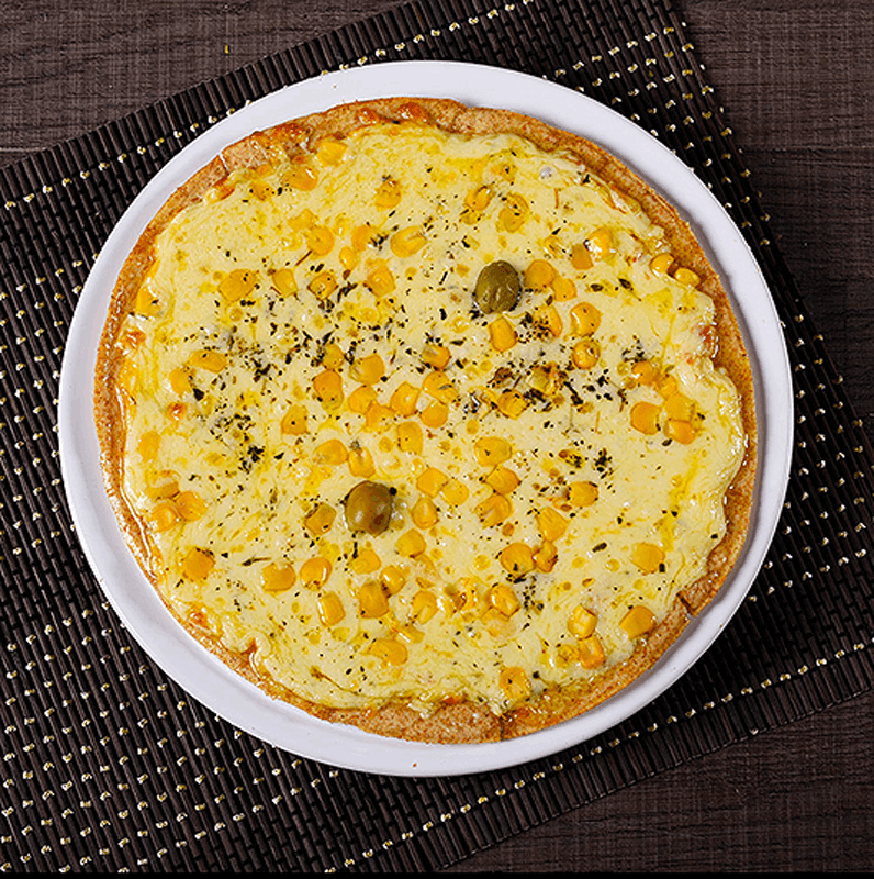 Pizza Grande de 35cm 8 pedaços, recheada com milho, mussarela, molho de tomate e orégano