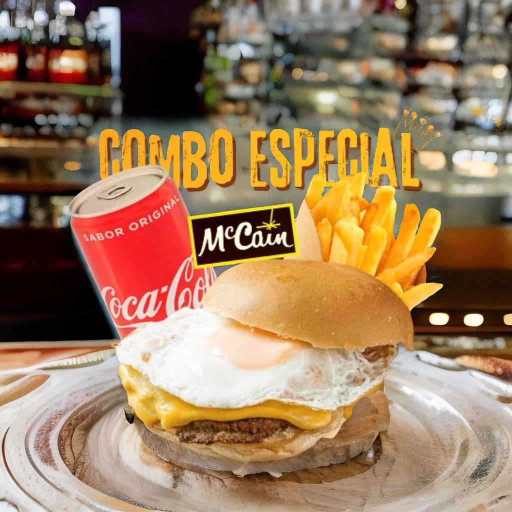 1 hambúrguer de contra filé bovino (aprox. 100g - in natura, fresco e moldado a mão na hora do pedido), muçarela, ovo, bacon e maionese defumada da casa. Acompanha fritas e bebida. ARRASTE PRA CIMA PARA ESCOLHER SUA BEBIDA E MOLHOS.