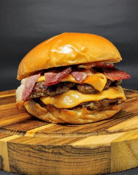 2 hambúrgueres de contra filé bovino (aprox. 100g cada - in natura, frescos e moldados a mão na hora do pedido), muçarela em dobro, bacon em cubos e maionese defumada da casa. Acompanha fritas e bebida. ARRASTE PRA CIMA PARA ESCOLHER SUA BEBIDA E MOLHOS.