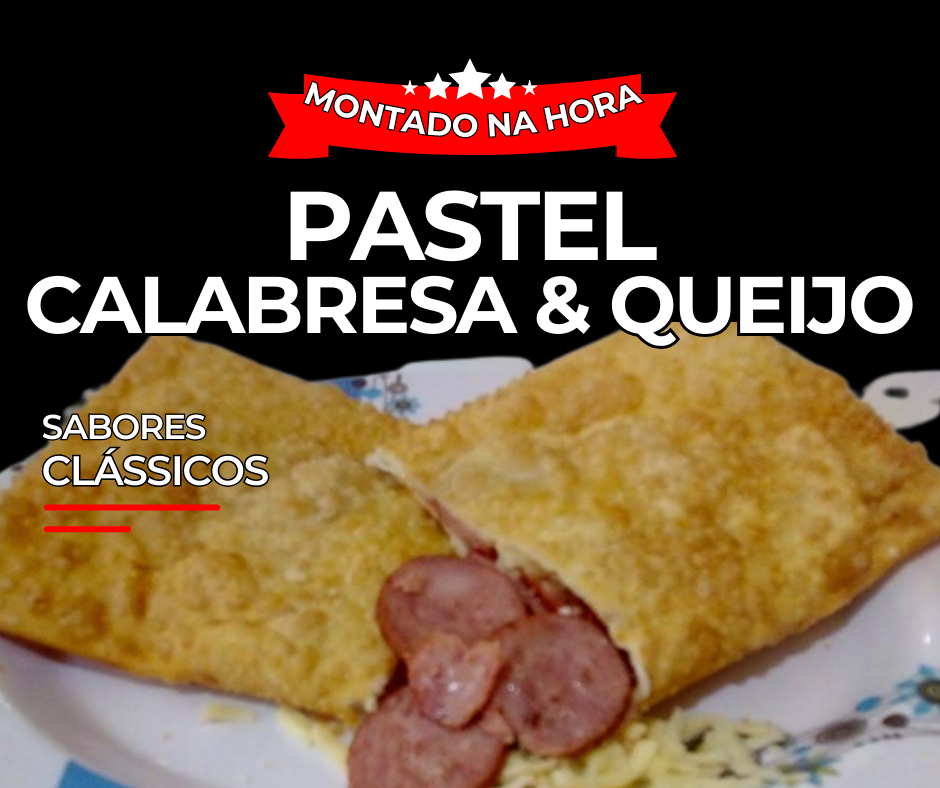 Pastel de 20cm super recheados com 15 fatias de calabresa e queijo muçarela. ARRASTE PRA CIMA PARA ESCOLHER SUA BEBIDA E MOLHOS