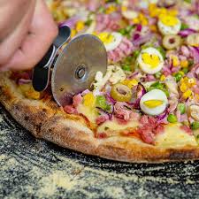 Pizza Grande de 35cm 8 pedaços, recheada com presunto, mussarela, ovo de codorna, tomate, pimentao, milho, cebola, molho de tomate e orégano