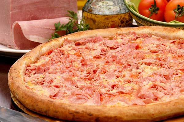 Pizza Grande de 35cm 8 pedaços, recheada com presunto, mussarela, molho de tomate e orégano