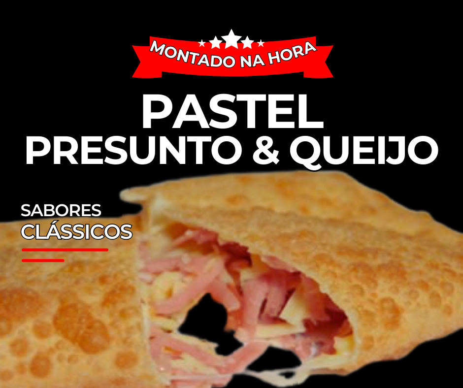 Pastel de 20cm super recheados com presunto ralado e queijo muçarela. ARRASTE PRA CIMA PARA ESCOLHER SUA BEBIDA E MOLHOS